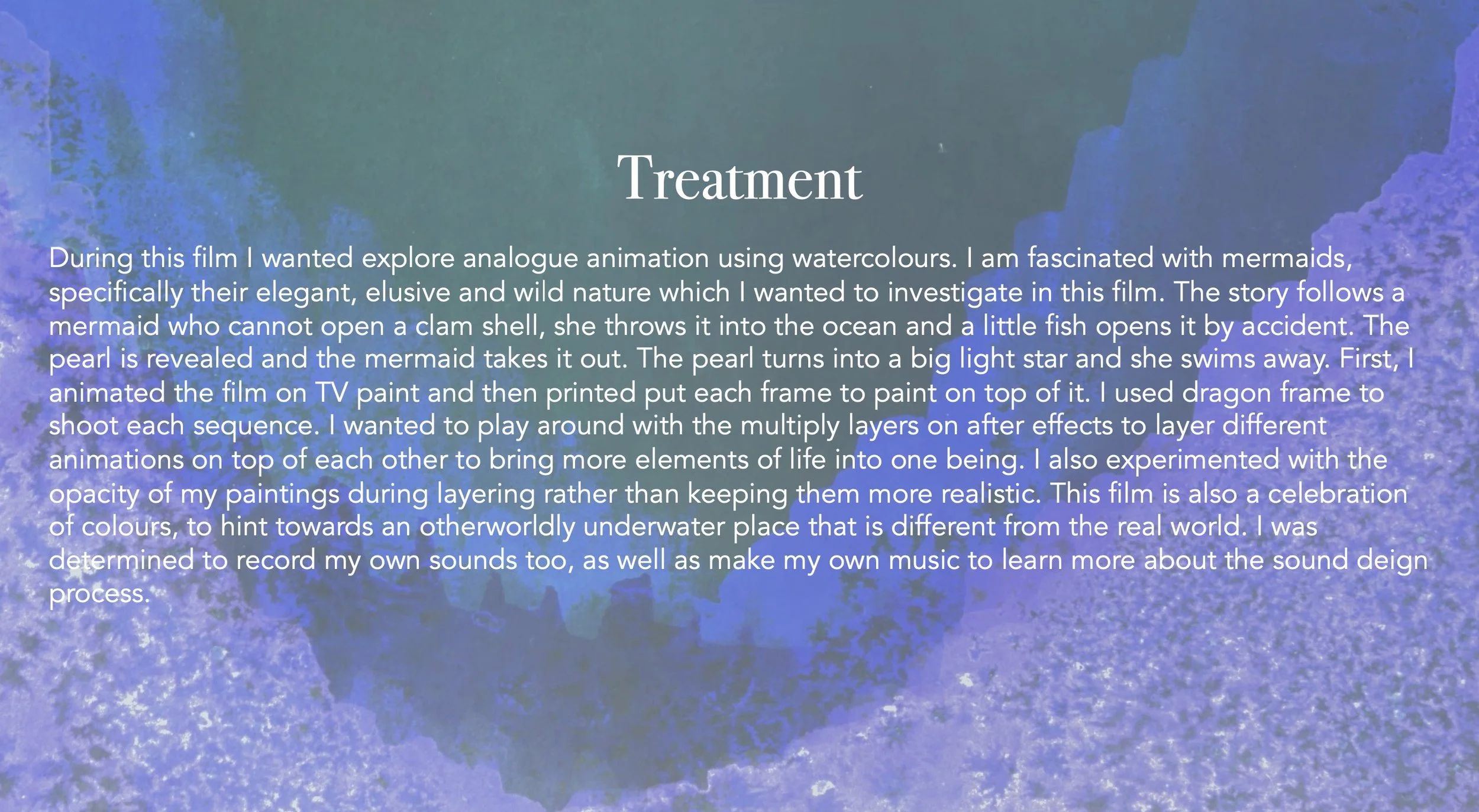 Sea Star is my second university film project. Here I wanted to explore analogue animation and integrating watercolours more. I also really enjoyed animating a mermaid and bringing to life the elegance as well as wildness of one. Below you will find project details and a trailer.